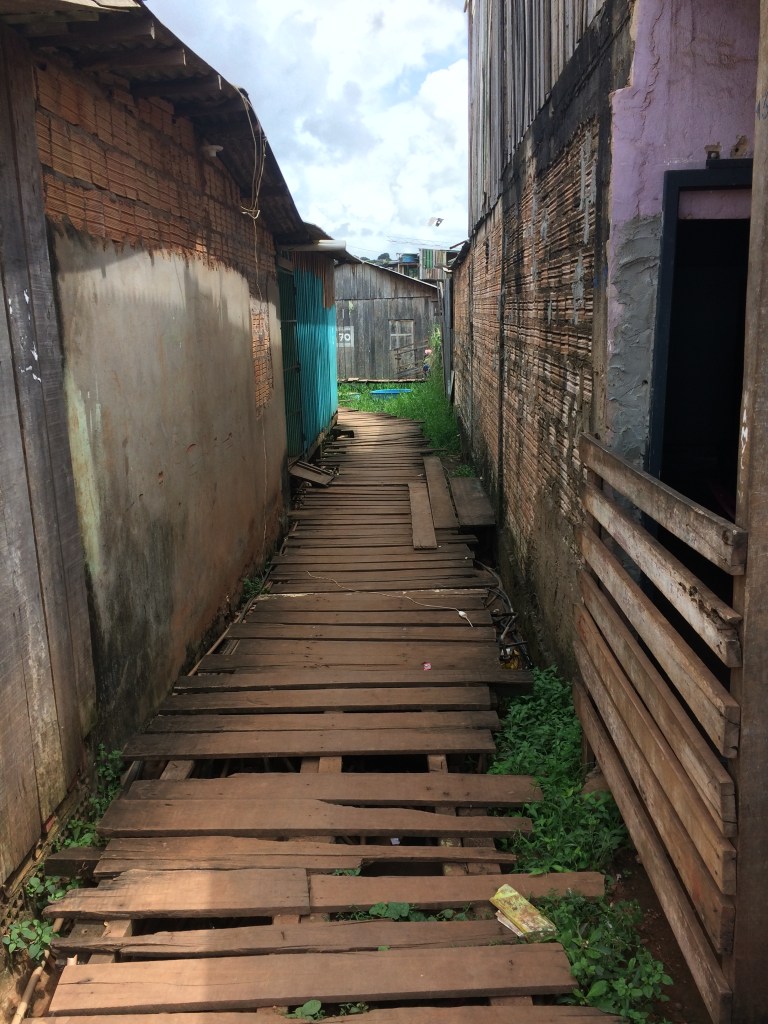 Na parte alagada do Jardim Independente I, a madeira é material predominante não só por ser mais acessível do que itens de alvenaria como cimento e tijolo, como também viabiliza a construção mais rápida. Além disso, as tábuas de madeira é um material mais facilmente reaproveitável, podendo até mesmo serem compradas de segunda mão. É frequente, em outras partes da cidade, encontrar casas construídas em alvenaria, mas com partes (cozinha, varanda, quartinho) adicionais construídas em madeira. Durante o deslocamento de várias famílias das beiras dos rios e igarapés, era comum ver nas frentes das casas em processo de desocupação pilhas e pilhas de madeira que, mais tarde, serviriam para transformar em moradia as casas de 63 m2 localizadas em um dos Reassentamentos Urbanos Coletivos. No Jardim Independente I, em maio de 2018, a madeira preenche a visão: é outdoor, é parede, muro, ponte, rua, janela, piso, grade, varanda.