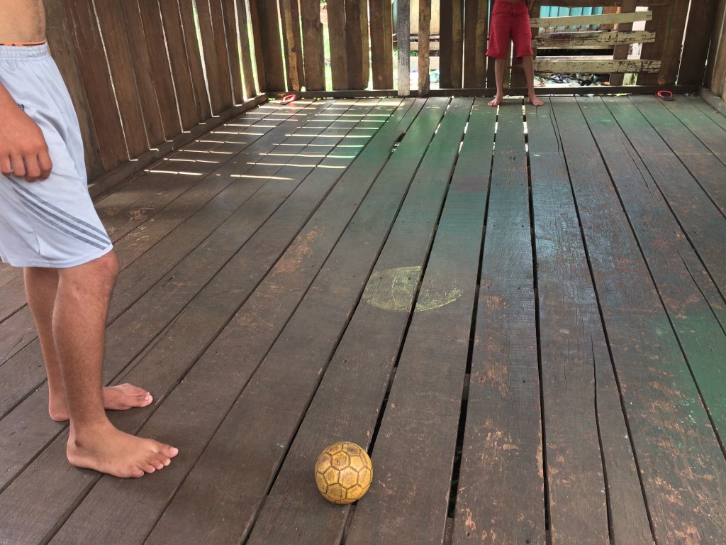 Interrompendo o silêncio do bairro e conferindo movimento às casas e às passarelas, alguns meninos jogavam bola dentro de uma moradia vazia. O que foi casa passou a ser quadra de esportes, no bairro que não conta com estruturas de lazer, não é servido por redes de água e esgoto.